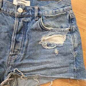 Reformation shorts, high-rise denim shorts, distressed jean shorts, blue cut-off shorts, summer fashion, casual women's shorts, eco-friendly denim, vintage wash shorts, festival outfit, sustainable fashion