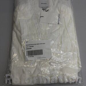 Romantic, feminine, and quintessentially Reformation — the Ketra Dress features a flattering slim-fit silhouette with delicate lace accents and a graceful V-neckline. Crafted in an ivory cotton–viscose blend, this midi dress includes puff sleeves, a button-down front, and a subtle front slit that adds movement and charm. The perfect choice for warm-weather events, dinners, or effortlessly polished daytime style.