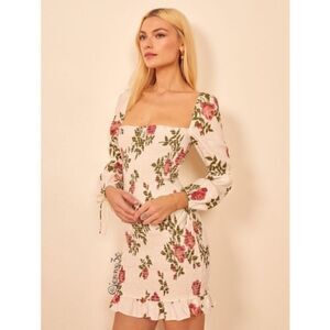 Reformation Women's Linen Dress Size L Hilary Floral Smocked Puff Sleeve