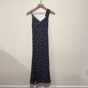Reformation "Trista" open back dress with an asymmetrical ruffled strap and side slit. Color is "bonne", navy with white flowers. worn once. perfect like new condition. Full length Lined Loose fitting Not bra friendly Open back Ruffled sleeve Straps tie in back V neck