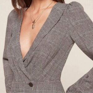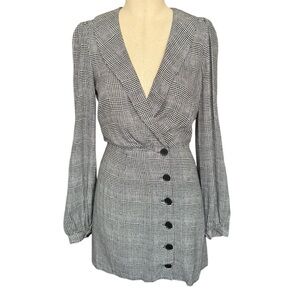 Reformation Woodbury Houndstooth Long Sleeve Mini Dress in heather gray. Your button-down is now a dress. This is a mini length, button front dress with a low v neckline, a shawl collar and a drapey bodice. In excellent condition! Like New!