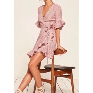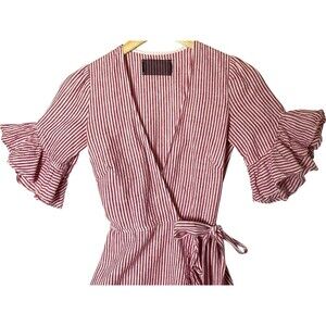 Reformation XS Kelsey Dress Red & White Linen Stripes Ruffles Mini Wrap Dress