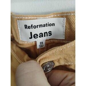 The Reformation Yellow Denim Higher Waist Wide Leg Pants in size 23 are a stylish and trendy addition to any woman's wardrobe. Made from a blend of lyocell and cotton, these pants feature a wide-leg design that is flattering and comfortable. The ankle length and higher waist provide a modern and on-trend look, perfect for pairing with a variety of tops and sandals. The vibrant yellow color adds a pop of fun and freshness to any outfit, making these pants a versatile and must-have piece for any fashion-forward woman.