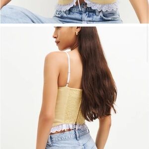 Reformation Yellow Lace-Up Crop Top with White Lace Trim