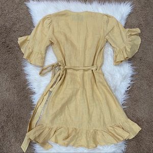 Chic yellow mini dress. Features ruffle sleeves and hem. Wrap style with a deep V-neck.