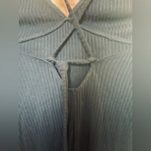 Criss cross straps in back. Ribbed material design. Stretchy.