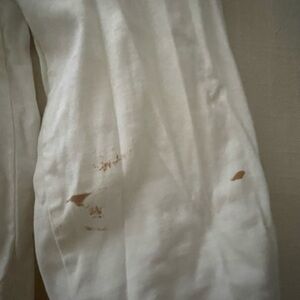 Longer in back. Scallop sides. Off white. Stain on sleeve pictured. Marked XS but is oversized and fits XS to M
