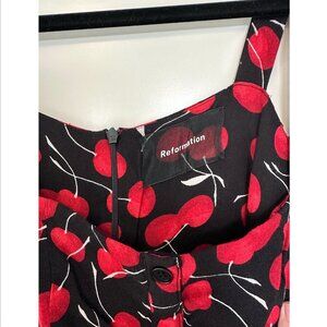 Sweetheart neckline midi dress with a cherry print on black background. Button front, although the bodice is sewn closed and only the skirt can unbutton. Unlined.