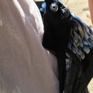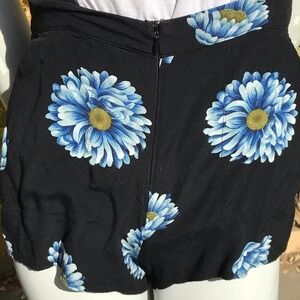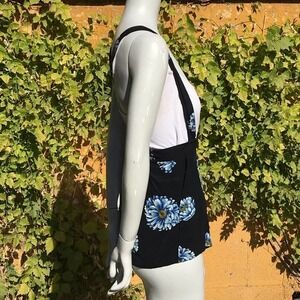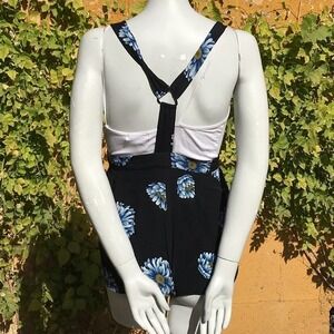 Reformation floral suspenders shorts. Suspenders are attached by front buttons. Front zip closure. Blue floral print on black background.