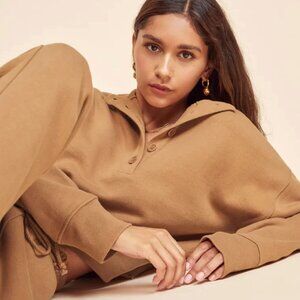 Reformation Marla Button pullover Sweatshirt in color "butterscotch", a beautiful camel brown.