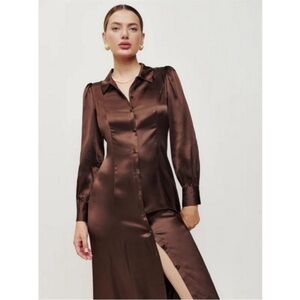 Chic brown satin dress with long sleeves and button details. Perfect for formal occasions.
