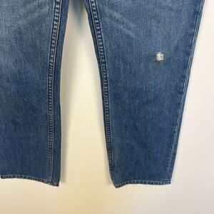 color: medium wash blue denim w some light distressing, raw edge waist