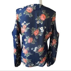 Reformation blue with floral print Sheer with cold shoulders size small long sleeve cinched at wrist Measurements- pit to pit 21" length 22" V-neck with buttons down front pre-loved excellent condition