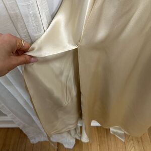 The Alani is a sleeveless silk dress in ivory. This is a full length gown with a slide slit and a halter neckline that ties at the neck and waist. It has an open back and meant to be a fitted waist.