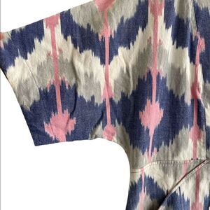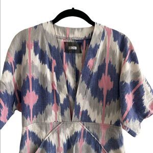 EUC Reformation Azura dress/tunic in a distinctive ikat print. Deep plunge neckline, loose boho fit, kimono sleeves. Slightly longer in back than front, great as a summer dress or chic swimsuit coverup.