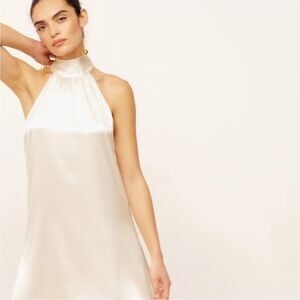 Slip into something silky. Shop the Corinth Dress from Reformation, a relaxed fit, sleeveless mini dress with a halter neckline that ties at the back neck.