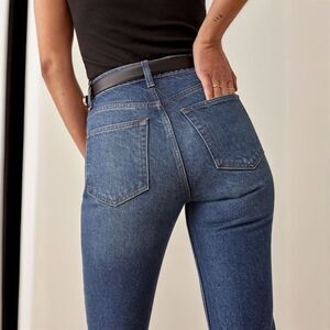 A must-have pair of sustainable denim! These are the iconic Reformation Cynthia Cuffed High Rise Straight Jeans in the Araceli wash. This style is known for its flattering, curve-hugging fit through the waist and hips, with a relaxed straight leg silhouette that gives a cool, vintage-inspired look.