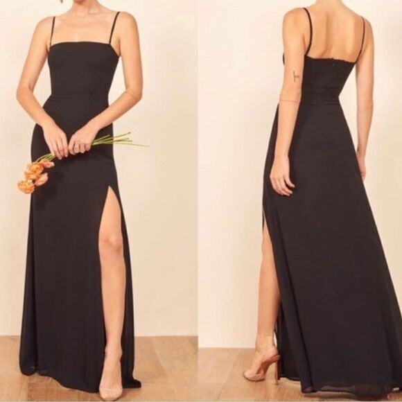 Reformation Ingrid Black Maxi Event Dress Slit Chiffon Strapless Spaghetti Strap