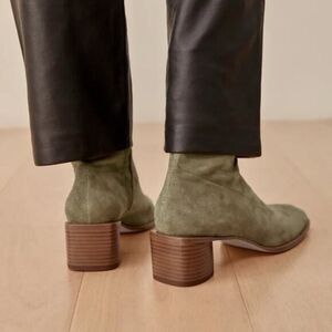 reformation boots, sock booties, green suede boots, square toe ankle boots, fall fashion, sustainable style, soft suede, stretch fit boots, minimal chic, neutral green, block heel boots, mid heel