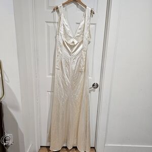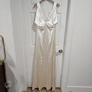 The Veria is a sleeveless, maxi dress with an adjustable, halter neckline and a wrap front that ties at the back neck. It features an open back and a ruched bodice for a more sophisticated look. It gives you a little extra shape.