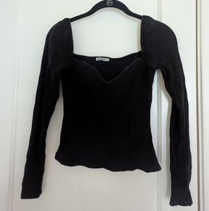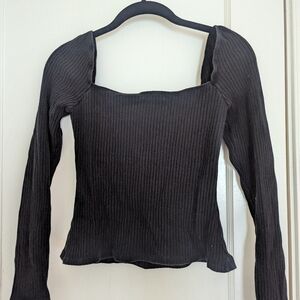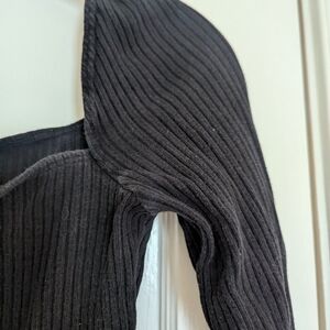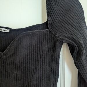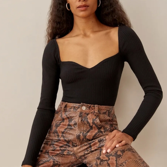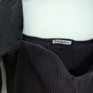 Super stretchy and skin hugging long sleeve Reformation top. The black has faded quite a bit, please see photos. It's true to a Reformation size large, which is more like a 6 or so in other brands. 45% Tencel and 45% cotton