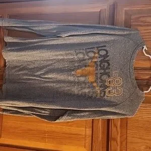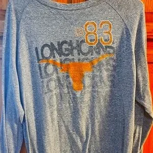Hook Em Horns!! show your texas pride with this sweet, light weight, long sleeve perfect for the crisp fall weather. worn a handful of times. showes no sign of wear but the neck is a little wider than I prefer. still in excellent condition ready to cheer on the longhorns. fits a little big for extra comfort.