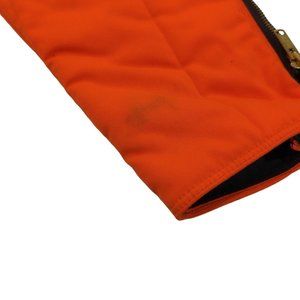 This high-visibility orange bib overall from RefrigiWear is perfect for workers in the construction industry. Made of durable polyester material and insulated with Kodofill technology, it provides warmth and comfort in cold weather. The bibs are pre-owned but still in great condition, and are designed for men. Personalization is not available. Made in the United States, these coveralls are perfect for anyone looking for reliable work clothing.