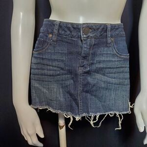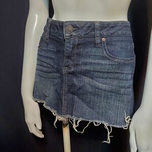 Elevate your denim game with this stylish Refuge Blue Raw Edge Denim Skirt in a size 9. This skirt features a trendy raw edge hem that adds a touch of edge to your look. Made from high-quality denim, this skirt is both comfortable and durable, perfect for everyday wear. The classic blue wash pairs effortlessly with a variety of tops, making it a versatile addition to your wardrobe. Whether you dress it up with heels or keep it casual with sneakers, this denim skirt is sure to become a staple in your closet. Add a touch of laid-back cool to your outfit with this pre-loved Refuge denim skirt.