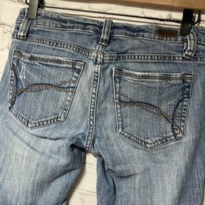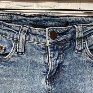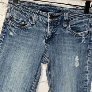 Slight stretch distressed denim straight leg fit. Has been worn and washed and the tag inside is faded ( see photo) but all else in excellent condition. Front features factory distress on both legs and hole as designed on left leg as shown.
