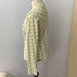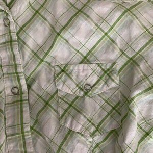 Refuge Lime green & white textured snap up western style shirt. Size Large measures: 18.5” (37”D) armpit to armpit, 32” waist, 24” length. Snap front, chest pockets & sleeve cuffs. Cute shirt! Preowned, normal wear. No discoloration, fading, yellowing, stains, rips or holes. Clean, smoke free home.