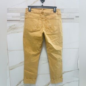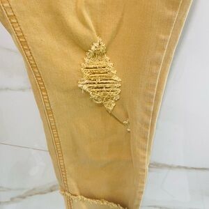 Refuge The jeans have a distressed style with rips and frayed cuffs. They feature a mid-rise waist with a double-button closure. Honey mustard tan color