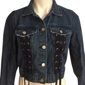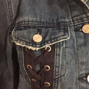 Refugee denim jacket lightly distressed with lace up corset front detail