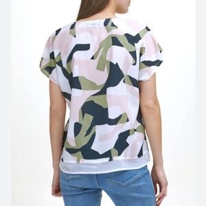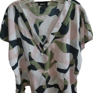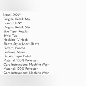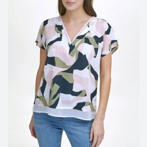 Reg $70 DKNY Womens White Sheer Layer Detail Printed Short Sleeve V Neck…