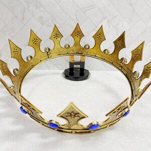 The product is a handmade XL gold crown, designed with a Royal Renaissance and Medieval theme, perfect for fans of Lord of The Rings. Made of metal, this crown features blue stones and is ideal for various occasions such as birthdays, proms, pageants, parties, cosplay, weddings, or as a gift. Handcrafted in the United States, this unique headpiece exudes a sense of elegance and fantasy, making it a standout accessory for any formal or themed event.