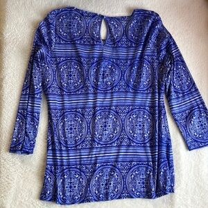 This dressy casual top from The Limited is the perfect addition to your wardrobe for any season. It features a light blue and white paisley print design on a 100% polyester material. The long sleeves add a touch of sophistication while the regular fit ensures a comfortable and flattering fit. Pair this top with your favorite jeans or dress pants for a classic and chic look.