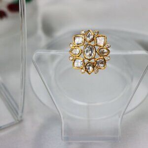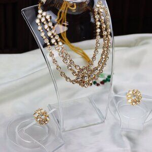 "Regal Triple-Layer Kundan Necklace & Earrings Set, JP34 Material - Embellished with premium-grade artificial Polki stones Exude royalty with this magnificent triple-layer Kundan necklace set, crafted from premium brass metal and embellished with radiant Polki stones. The intricate floral centerpiece adds a touch of traditional charm, making it perfect for weddings, festive occasions, and grand celebrations. Material: High-quality brass metal with rich gold-tone plating Design: Triple-layered Kundan necklace with central floral motif Set Includes: One statement necklace and matching floral stud earrings Stone Work: Handcrafted Polki-style stones for a brilliant, reflective shine Earrings: Coordinated floral studs for a complete ethnic look Craftsmanship: Intricate, traditional Indian jewelry detailing Occasions: Ideal for bridal wear, festive events, and cultural ceremonies Durability: Tarnish-resistant finish for long-lasting brilliance"