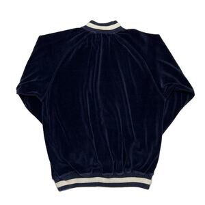 Pullover long sleeve jacket is a quarter zip. Has raglan sleeves with elbow patches. White trim on the hem, cuffs and neckline. Navy velour fabric. Embroidered nautical brand logo on the front. Vintage 1990s.