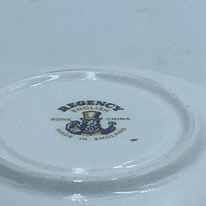 Regency English bone china teacup and saucer featuring purple and yellow pansies. Made in England. Pre-owned, good condition.