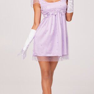 Dismiss what society thinks and do what pleases you. Channel your inner queen and ignore the foolishness of the ton in this exclusive Regency Viscountess costume featuring a light purple mini dress with a scoop neckline, shimmering sheer cap sleeves with pearl detailing, a structured empire waist with lace appliques, a shimmering overlay with pearl detailing, and a back zipper closure.
