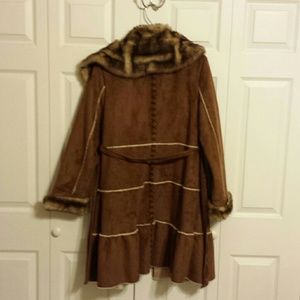 100% Polyester with 100% Acrylic backing trimming. 100% faux fur. Nice warm coat. Been in closet. Only worn twice.