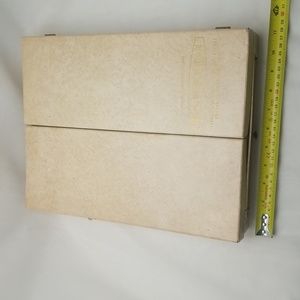 Vintage mid century Regent Sheffield Cutlery leaf design 19 piece stainless steel presentation set in original metal hinged cardboard box. Box is 14" x 11" and 2 ½" thick. The knife and fork in the left pannel have a plain handle, box has some damage, glue on left side of box needs re-glueing and cardboard scroll cut out is missing on left side ( see last 5 pics ).