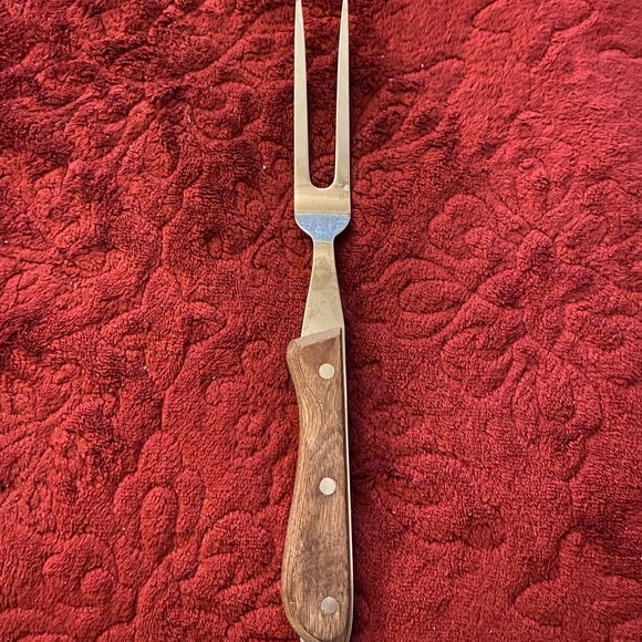 Enhance your dining experience with this elegant Regent Swords stainless steel carving fork. Featuring a sturdy wooden handle with no cracks or chips. It is in excellent condition. It is 11.5 inches long from tip to tip.