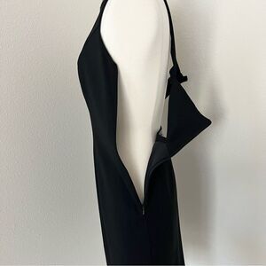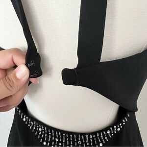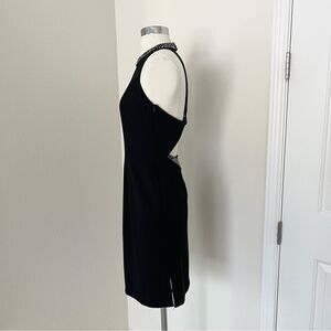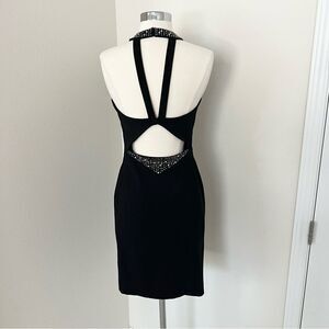 Stunning beaded little black dress with a back cutout. So cute! Has a side zipper and back fasteners. The mid back fasteners are a hook on one side and thread on the other where the hook can fasten. The neck fasteners are the hook and loops instead of threads. Excellent used condition! Vintage 90s