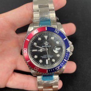 Never worn or opened Reginald stainless steel watch. Wrap still around this beautiful piece. Details include half blue half red on the frame of the watch. States inside the watch that it is also water resistant. Perfect for everyday wear.