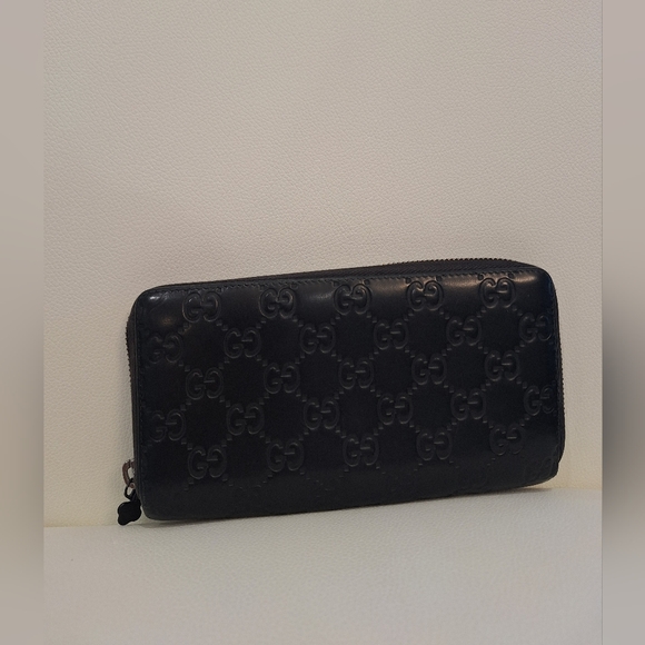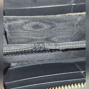 Repair inside zipper *see photo*. Chic black wallet with Gucci embossed pattern. Features a secure zip closure.