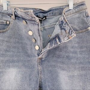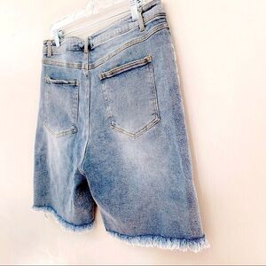 These Bermuda shorts feature an asymmetrical waist that buttons up, and has a raw hem with light wash finish. Inseam is approximately: 11” and total length of the shorts is approx: 19.5” These shorts are listed as a size Large. Consider this a size 10/12. Size 10-11 if you want a looser fit, 12 if you want a tighter fit.