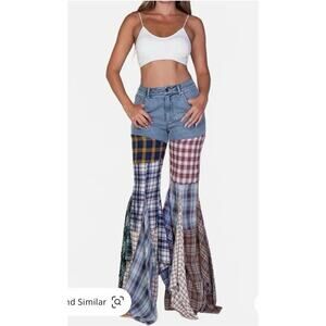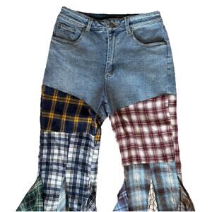 Rehab Lab Patchwork Multi Plaid Flannel Bell Bottom Jeans S Boho Grunge Hippie