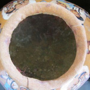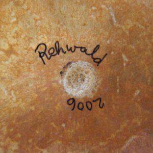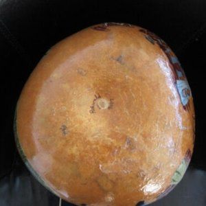Real gourd signed by artist Rehwald, 2006. Whimsical appliqués of Teddy Bear in Western Gear with leather band around rim. Ideal for a child's bedroom.