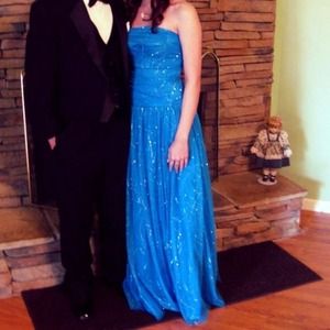 Bright blue dress with a blue sparkle overlay and corset-like back with zipper on the side as well. Strapless and has only been worn once! Size 5/6.