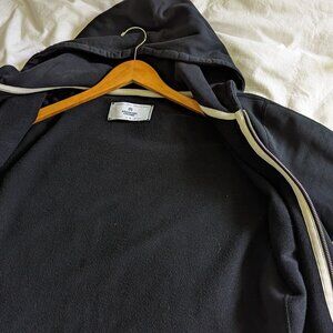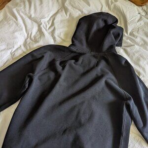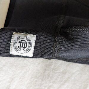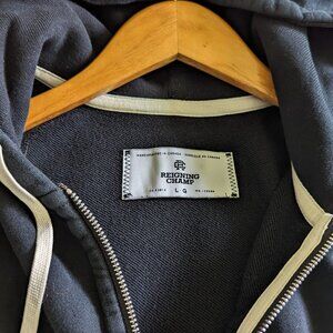 I believe this is the midweight terry classic hoodie from Reigning Champ. Black, size L. I am not super familiar with their products but based on their site descriptions that seems correct. I bought new at Bluebird in Seattle maybe 7 years ago, lightly worn since in non-athletic situations. Color still strong, looks great. Rib on one sleeve came partially unstitched, has been repaired, shown in pictures.